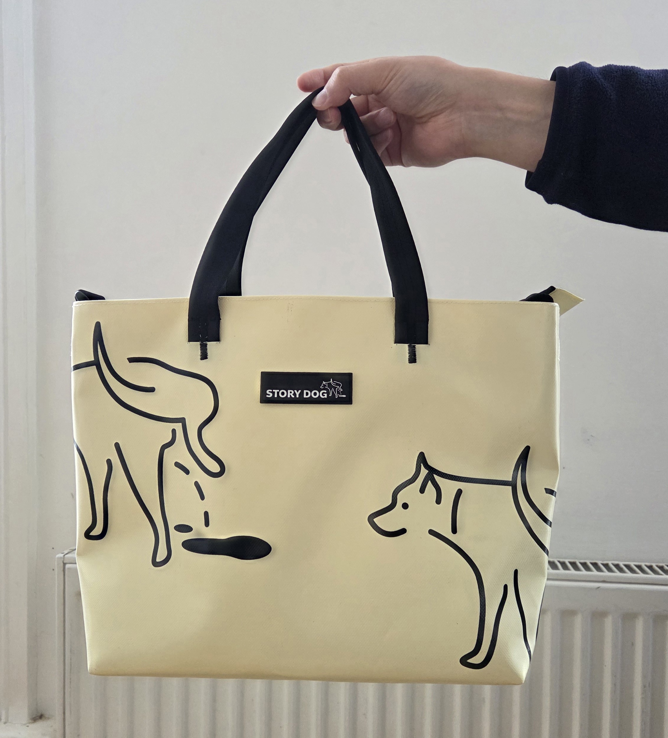 내가 구매한 가방은 아이보리 색상에 강아지가 오줌 싸는 디자인.